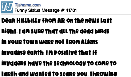 X is Dear Hillbilly from AR on the news last night, I am sure that all the dead birds in your town were not from Aliens invading earth, I'm positive that if invaders have the technology to come to Earth and wanted to scare you, throwing birds at you would no