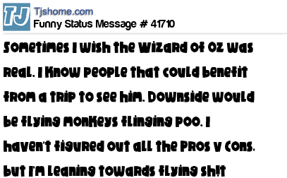 X Sometimes I wish the Wizard of Oz was real. I know people that could benefit from a trip to see him. Downside would be flying monkeys flinging poo. I haven't figured out all the Pros v Cons, but I'm leaning towards flying sh!t bombs. I hate stupid people.