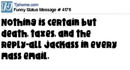 X Nothing is certain but death, taxes, and the reply-all jackass in every mass email.
