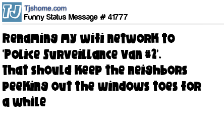 - # 40241 I've just renamed my wifi network to "Police Surveillance Van #02". That should keep the neighbors on their toes for a while.