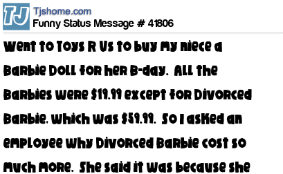 - # 145276 Q: What comes with the new Divorced Barbie doll? A: All Ken's stuff. -I. M. F.