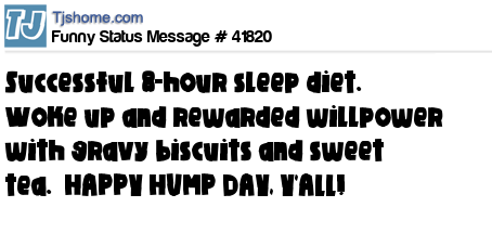 X Successful 8-hour sleep diet. Woke up and rewarded willpower with gravy biscuits and sweet tea. HAPPY HUMP DAY, Y'ALL!
