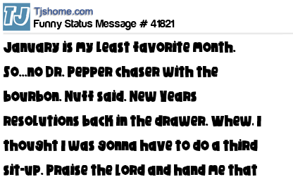 X is January is my least favorite month. So...no Dr. Pepper chaser with the bourbon. Nuff said. New Years resolutions back in the drawer. Whew, I thought I was gonna have to do a third sit-up. Praise the Lord and hand me that ice bucket.