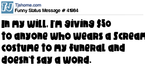X  In my will, I'm giving $50 to anyone who wears a Scream costume to my funeral and doesn't say a word.