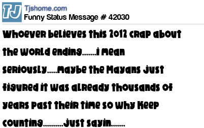 X says whoever believes this 2012 crap about the world ending.......i mean seriously.....maybe the Mayans just figured it was already thousands of years past their time so why keep counting..........just sayin.......