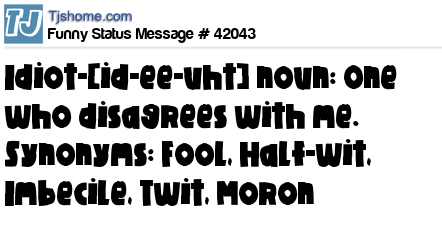 X Idiot-[id-ee-uht] noun: One who disagrees with me. Synonyms: Fool, Half-wit, Imbecile, Twit, Moron