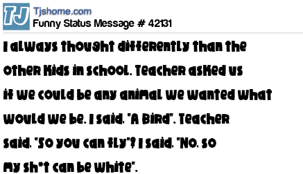 X says I always thought differently than the other kids in school. Teacher asked us if we could be any animal we wanted what would we be. I said, "A Bird". Teacher said, "So you can fly"? I said, "No, so my sh*t can be white".