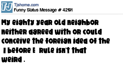X My eighty year old neighbor neither agreed with or could conceive the foreign idea of the “I before E” rule isn't that weird .