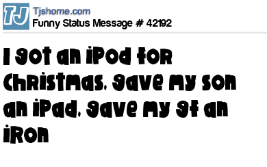 - # 99124 I just bought my daughter an iPad, my son an iPod, myself an iPhone...and the wife an iRon. She wasn't impressed even after I explained it can be integrated with the iWash, iCook and iClean network. This sadly triggered the iNag service, which in turn wip