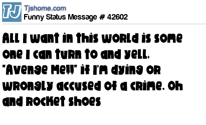 X says All I want in this world is some one I can turn to and yell, "Avenge Me!!" if I'm dying or wrongly accused of a crime. Oh and rocket shoes
