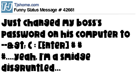 X just changed my boss's password on his computer to --> C : [Enter] # # #....yeah, I'm a smidge disgruntled...