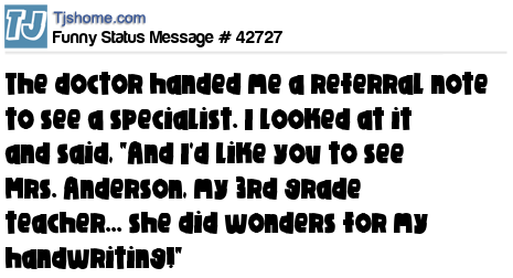 X The doctor handed me a referral note to see a specialist. I looked at it and said, "And I'd like you to see Mrs. Anderson, my 3rd grade teacher... she did wonders for my handwriting!"