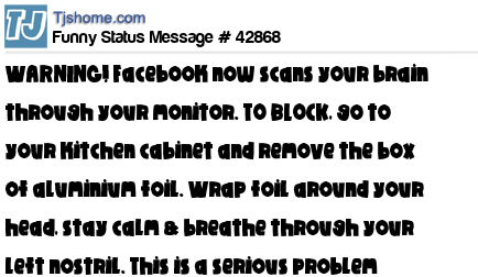 - # 44275 URGENT WARNING! Facebook now automatically scans your brain through your monitor. To block, go to kitchen, get aluminum foil, and wrap it around your head. Stay calm and breathe through your left nostril ONLY. This is a SERIOUS problem and has been confir