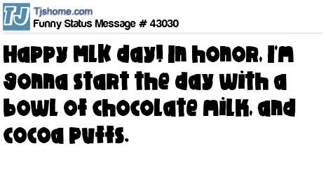 X is Happy MLK day! In honor, I'm gonna start the day with a bowl of chocolate milk, and cocoa puffs.