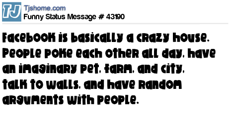 X Facebook is basically a crazy house. People poke each other all day, have an imaginary pet, farm, and city, talk to walls, and have random arguments with people.