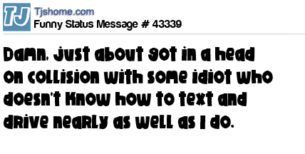 X Damn, just about got in a head on collision with some idiot who doesn't know how to text and drive nearly as well as I do.