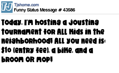 X is Today, I'm hosting a jousting tournament for ALL kids in the neighborhood! All you need is: $10 (entry fee), a bike, and a broom OR mop!