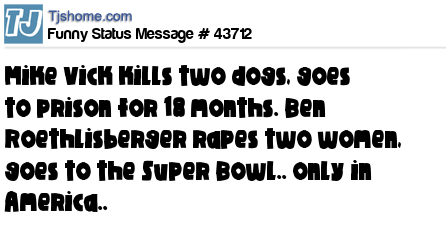 X is Mike Vick kills two dogs, goes to prison for 18 months. Ben Roethlisberger rapes two women, goes to the Super Bowl.. only in America..