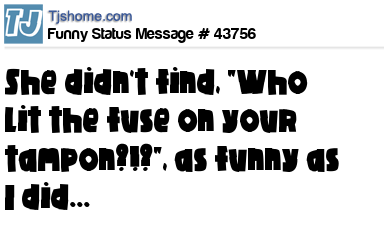 - # 44299 apparently my wife didnt think "Who lit the fuse on your tampon?" was half as funny as my friends did
