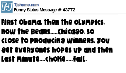 X  first Obama, then the olympics, now the Bears.....Chicago, so close to producing winners, you get everyones hopes up and then last minute....choke.....fail.