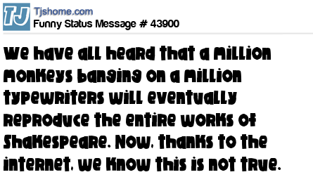 - # 15035 thinks it's funny that Evolutionists believe enough million monkeys will eventually type out a literary work. Facebook has proven this wrong.