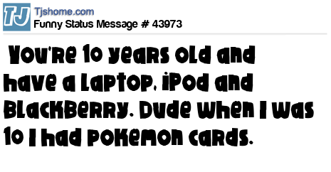 X is You're 10 years old and have a laptop, iPod and BlackBerry. Dude when I was 10 I had pokemon cards.