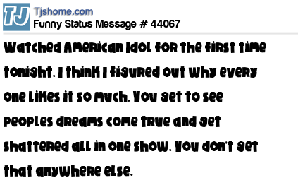 X has watched American Idol for the first time tonight. I think I figured out why every one likes it so much. You get to see peoples dreams come true and get shattered all in one show. You don't get that anywhere else.