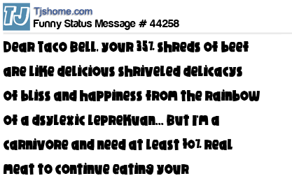 X says Dear Taco Bell, your 35% shreds of beef are like delicious shriveled delicacys of bliss and happiness from the rainbow of a dsylexic leprekuan... But I'm a carnivore and need at least 70% real meat to continue eating your contramptions.... Please work on