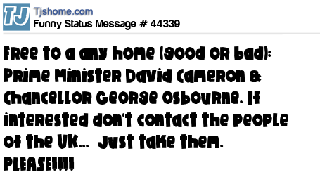 X Free to a any home (good or bad): Prime Minister David Cameron & Chancellor George Osbourne. If interested don't contact the people of the UK... Just take them. PLEASE!!!!
