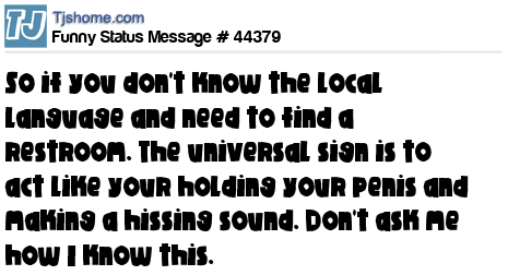 X So if you don't know the local language and need to find a restroom. The universal sign is to act like your holding your penis and making a hissing sound. Don't ask me how I know this.