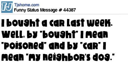 X is I bought a car last week. Well, by "bought" I mean "poisoned" and by "car" I mean "my neighbor's dog."