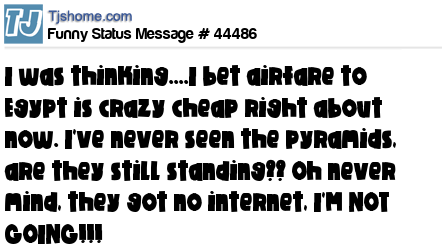 X says I was thinking....I bet airfare to Egypt is crazy cheap right about now. I've never seen the pyramids, are they still standing?? Oh never mind, they got no internet, I'M NOT GOING!!!