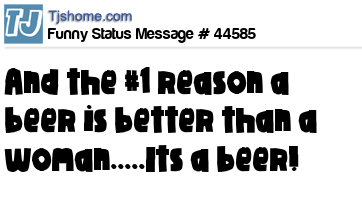 - # 107257 Why a Beer is better than a woman! 1.A beer doesn't get jealous when you grab another! 2. Pour your beer right and you always get good head! 3. You always know when youre the first to pop a beer! 4.You can have several beers in a night and not feel guilty