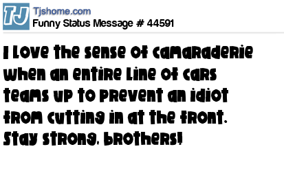 - # 58878 I love the sense of camaraderie when an entire line of cars & trucks team up to prevent a jerk from cutting in at the front. Stay strong brothers and sisters!