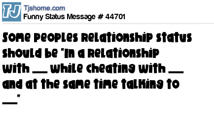 - # 62413 Thinks some peoples relationship status should be "In a relationship with ___ while cheating with ___ and at the same time talking to ___"