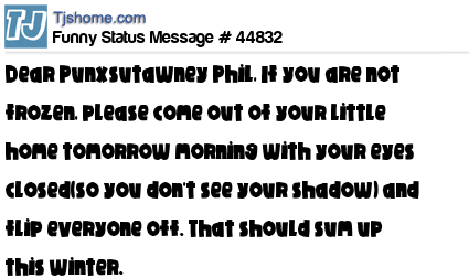 X  Dear Punxsutawney Phil, If you are not frozen, please come out of your little home tomorrow morning with your eyes closed(so you don't see your shadow) and flip everyone off. That should sum up this winter.