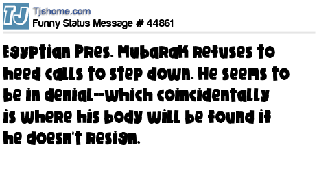 - # 46017 Â Egyptian Pres. Mubarak finaly steps down. I think he was in denial--which coincidentally is where his body will be found if he doesn't move far far away..