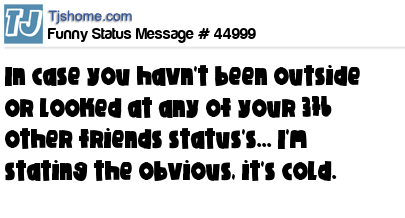 X  In case you havn't been outside or looked at any of your 376 other friends status's... I'm stating the obvious, it's cold.