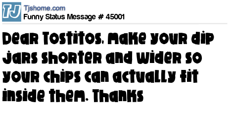 X says Dear Tostitos, make your dip jars shorter and wider so your chips can actually fit inside them. Thanks