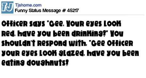 - # 27234 discovered today that when a police officer says, "Ma'am, your eyes look red. Have you been drinking?", you should never respond with "Officer, your eyes look glazed. Have you been eating doughnuts?"