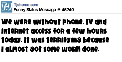 X We were without phone, TV and internet access for a few hours today. It was terrifying because I almost got some work done.