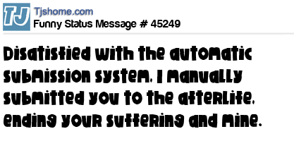 X is Disatisfied with the automatic submission system, I manually submitted you to the afterlife, ending your suffering and mine.