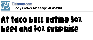 - # 35768 Great taco from Taco bell today......with the spoon of meat and all the lettuce I was not sure if it was for eating or smoking!
