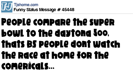 X is People compare the super bowl to the daytona 500, thats BS people dont watch the race at home for the comericals...