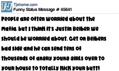 X People are often worried about the mafia, but I think it's Justin Beiber we should be worried about. Get on Beibers bad side and he can send tens of thousends of angry young girls over to your house to totally kick your butt! Beib's the new John Gotti.