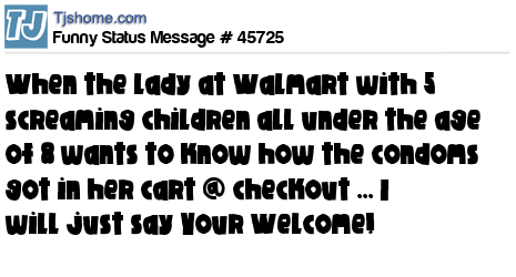 X When the lady at Walmart with 5 screaming children all under the age of 8 wants to know how the condoms got in her cart @ checkout ... I will just say Your Welcome!