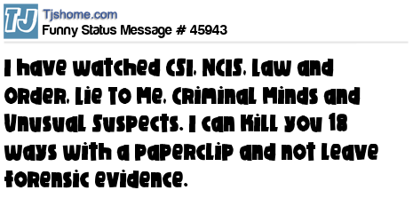 X I have watched CSI, NCIS, Law and Order, Lie To Me, Criminal Minds and Unusual Suspects. I can kill you 18 ways with a paperclip and not leave forensic evidence.