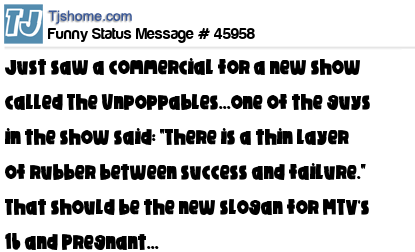 X Just saw a commercial for a new show called The Unpoppables...one of the guys in the show said: "There is a thin layer of rubber between success and failure." That should be the new slogan for MTV's 16 and Pregnant...