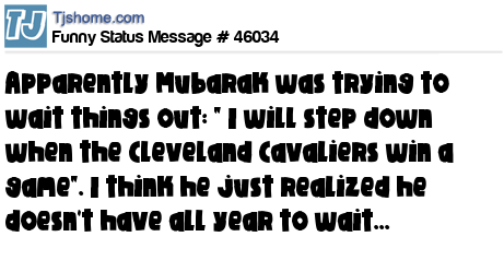X says Apparently Mubarak was trying to wait things out: " I will step down when the Cleveland Cavaliers win a game". I think he just realized he doesn't have all year to wait...