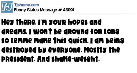 X Hey there, I'm your hopes and dreams, I won't be around for long so lemme make this quick. I am being destroyed by everyone. Mostly the president. And shake-weight.